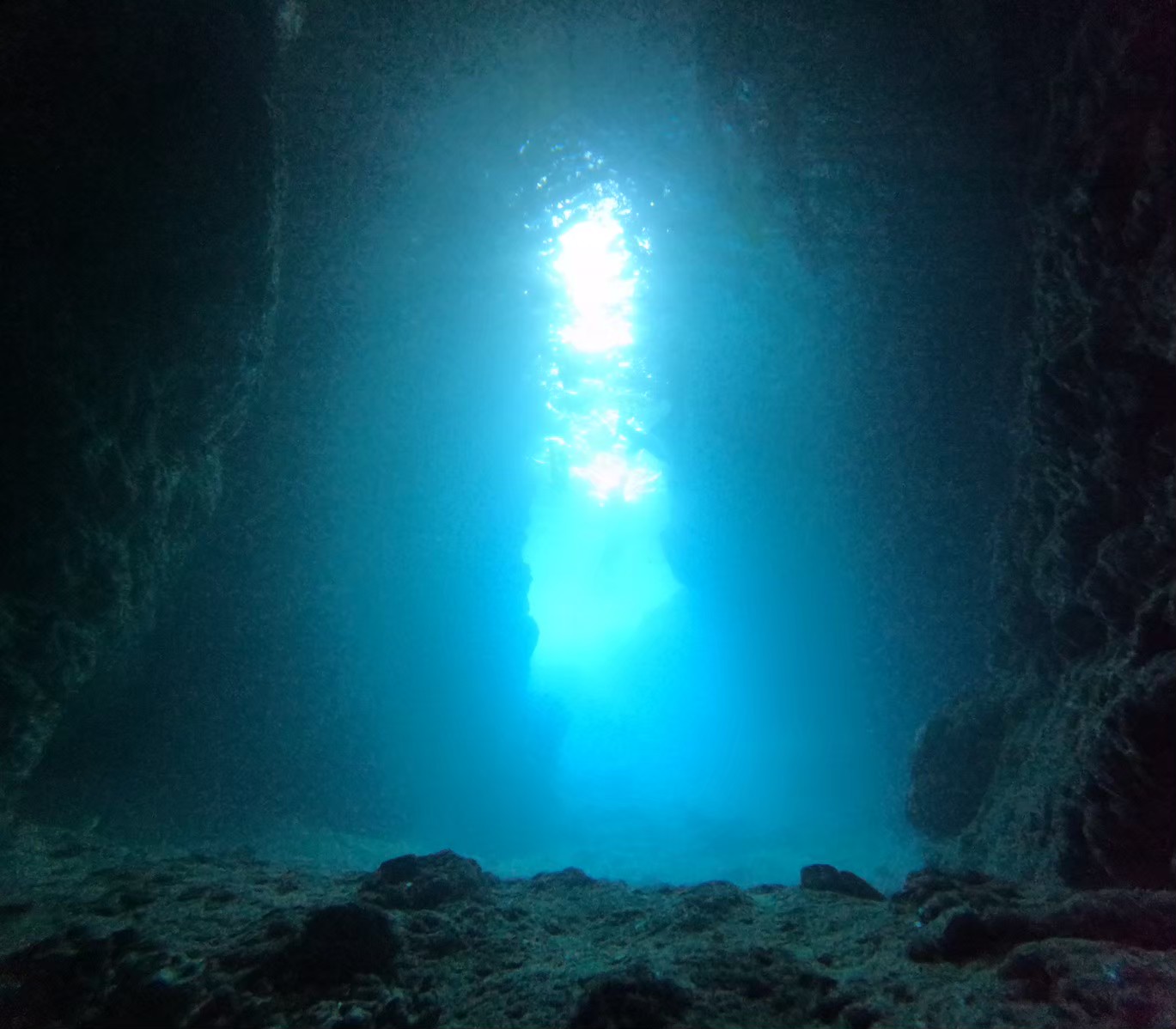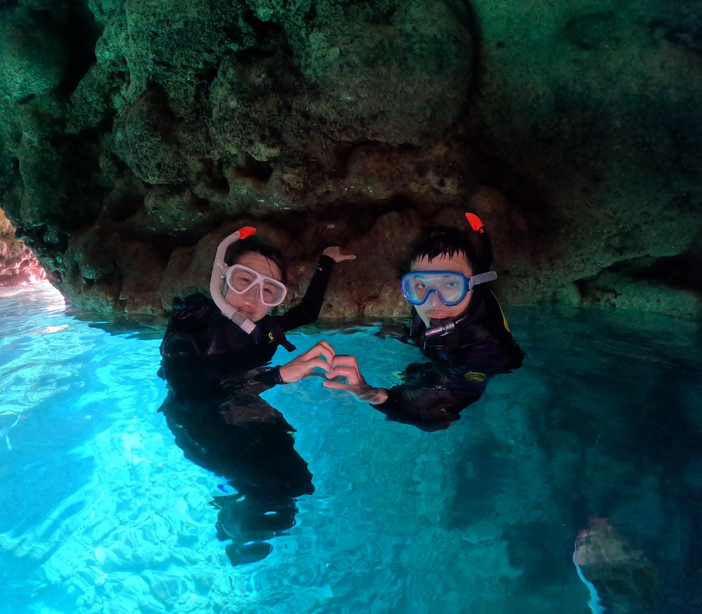 目的地「青之洞窟」是一處最深僅有6m左右的洞窟,從入口至可觀光區域的極限為止,最長約35m左右,據說這種形狀是因受到波浪長年侵蝕所形成。此外,青之洞窟內的魚群親近人類,所以會主動靠近人的身邊。由於此地棲息的魚類、珊瑚種類十分豐富,因此青之洞窟又可說是「沖繩海洋活動的聖地」,是最適合首次體驗海洋活動的旅客造訪的景點。