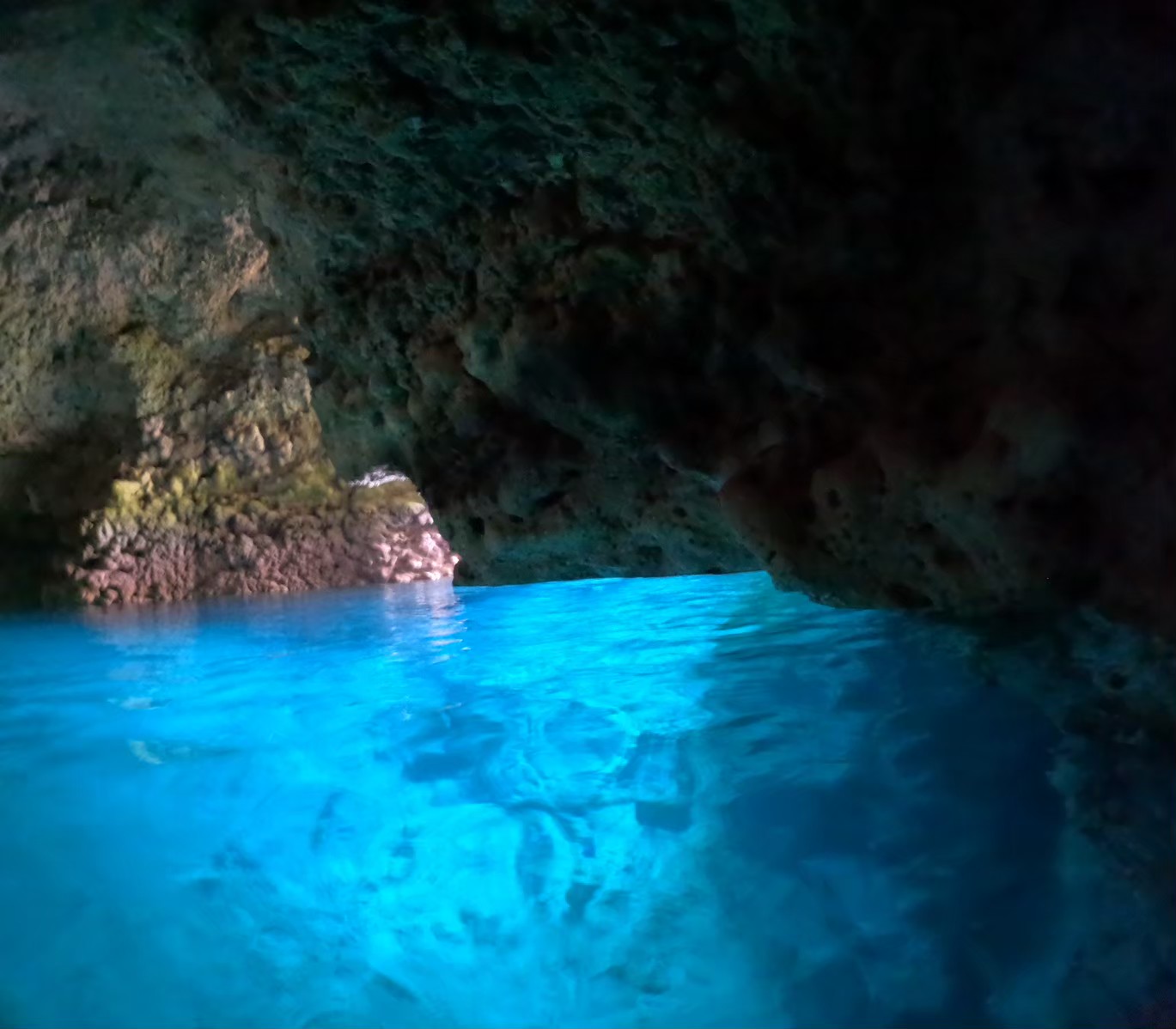 青之洞窟指的是因海水侵蝕作用所形成的洞窟(海蝕洞)之一。洞窟內部的海面因為日光折射而閃耀出神秘的藍光,因此被稱為「青之洞窟」(藍洞,青洞),在這裡可以體驗由大自然的巧合交織而出的神秘氣氛。青之洞窟之所以發出藍光,是因為日光照進洞窟內後,其光線從海底反射而出,使水面閃耀藍光所致。青之洞窟內的海底是含有石灰質的砂地(白砂地),這是可以反射出美麗日光的重要因素之一。此地是一處能優美反射日光的地點,因此可以享受特別湛藍耀眼的光芒。由地形、砂、日光等各式各樣大自然的巧合所交織產生的景色,奇幻與神祕難以言語盡述。